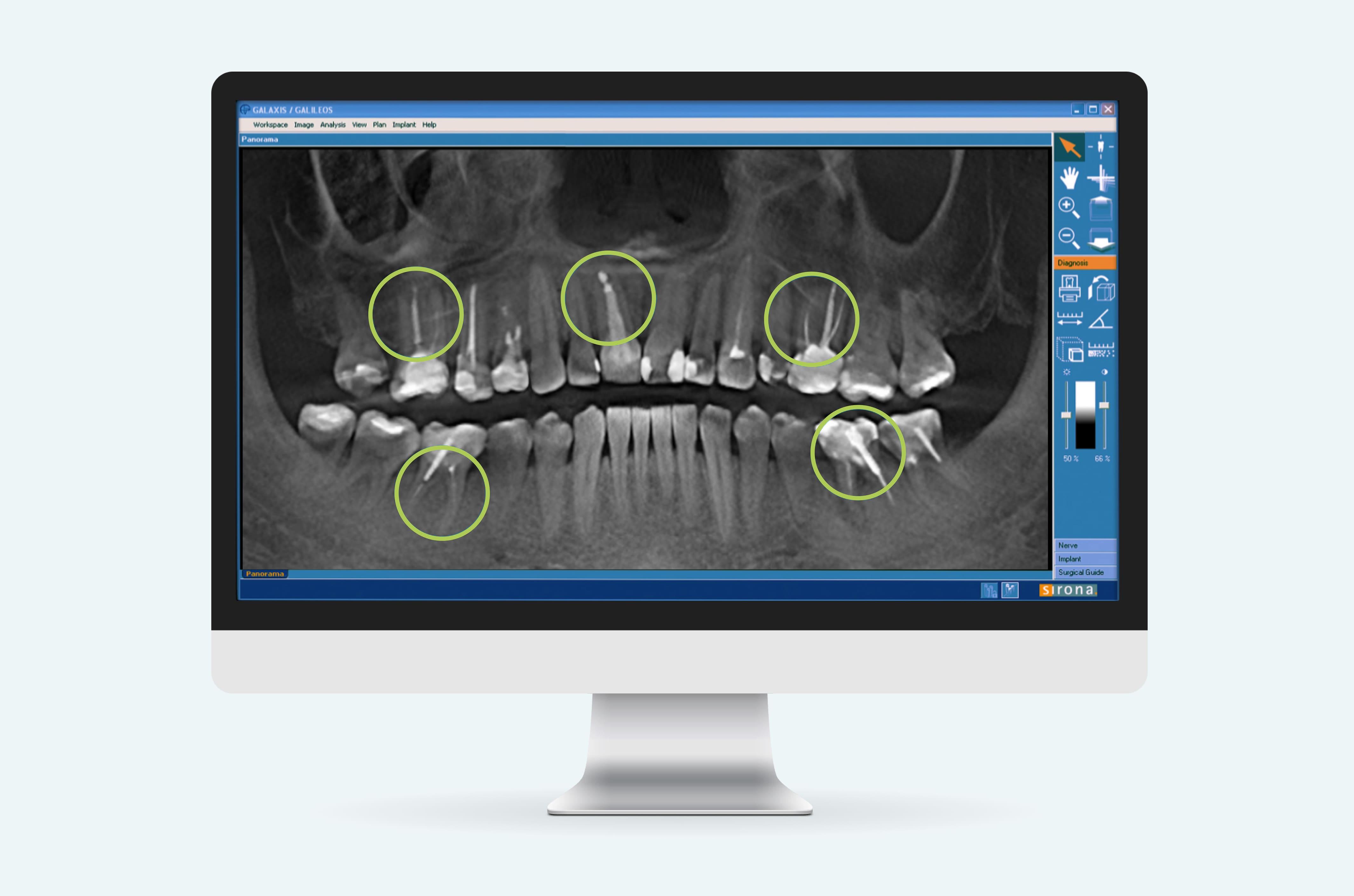 Уникальность томографического снимка заключается в том, что врач имеет возможность рассмотреть зуб во всех мыслимых срезах, под любым углом. Сначала врач рассматривает общий снимок, выявляет потенциально проблемные зубы и затем внимательно изучает срезы каждого такого подозрительного зуба — чтобы не пропустить начинающееся заболевание. Томография легко «ловит» то, что невозможно увидеть на обычном рентгеновском снимке зуба.