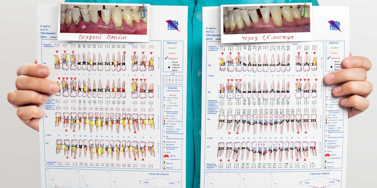 Даже при самом серьезном диагнозе совместными усилиями врача и пациента можно добиться поразительных успехов. Между двумя этими фотографиями (и двумя пародонтальными картами) — всего полтора месяца.